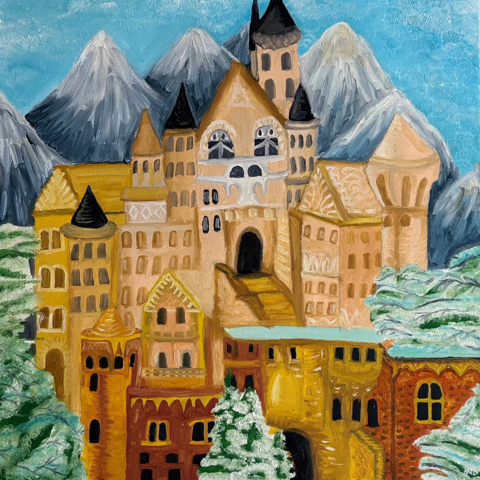 The pinting ‘Princess Castle’ depicts a majestic structure nestled among picturesque mountains and fairy-tale landscapes. Its architecture exudes charm and mystery, evoking dreams of enchanted worlds.